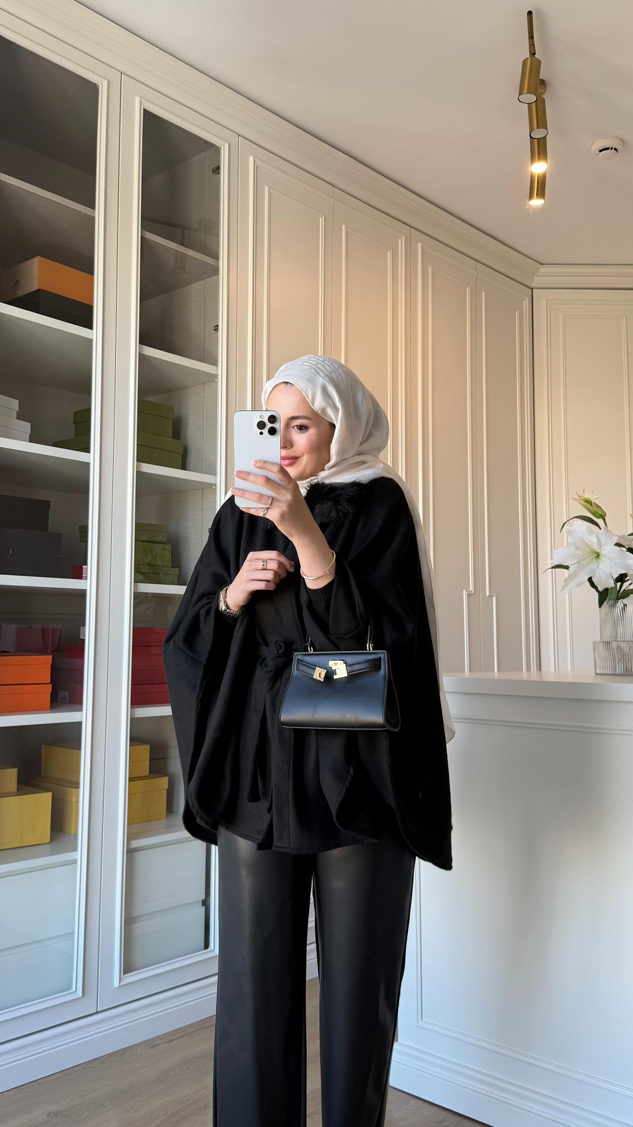 Yakası Kürklü Panço Siyah